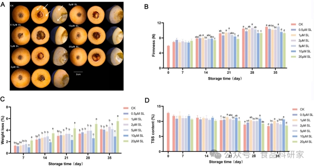 图2 不同浓度的独脚金内酯(SL)处理对冷贮枇杷果实的影响