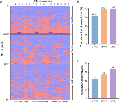 枇杷属共约有30余个种(变种或变型),但是只有普通枇杷被广泛应用于生产导致栽培枇杷的遗传背景相对狭窄。因此,通过三倍体减数分裂异常的特征,快速诱导倍性变异和染色体拷贝数变异,形成整倍体和非整倍体,能极大程度地增加种质资源多样性。然而,大多数三倍体植物的育性较低,导致三倍体植物染色体的遗传变异及后代的表型变异研究较少。团队研究发现,三倍体枇杷Q24杂交后代群体的染色体数目偏离预期的正态分布,93.82%植株的染色体数目分布在34~46条。进一步对杂交后代的分子核型进行统计发现,Q24的17条染色体都能以二体(同一条染色体有2个拷贝)的形式被传递给后代,但频率存在较大差异(图1)。性状观测结果显示,三倍体枇杷杂交后代存在非常丰富的表型;染色体数目、核型以及父本基因型都对非整倍体枇杷的表型产生影响。同时,研究发现,染色体上的基因功能以及染色体间的共线性影响三倍体枇杷基因组的非整倍化。利用育性较高的三倍体可大量创制以非整倍体为特征的多样化枇杷种质,有获得特异性状材料的可能性,为改变枇杷遗传背景相对狭窄,增加枇杷种质多样性,选育具有突破性性状的枇杷材料奠定了基础。本研究的主要结果也进一步证实了三倍体有性生殖途径可使植物基因组产生较大变异的可能性,为其他被子植物利用三倍体有性生殖途径创制新材料提供了依据。