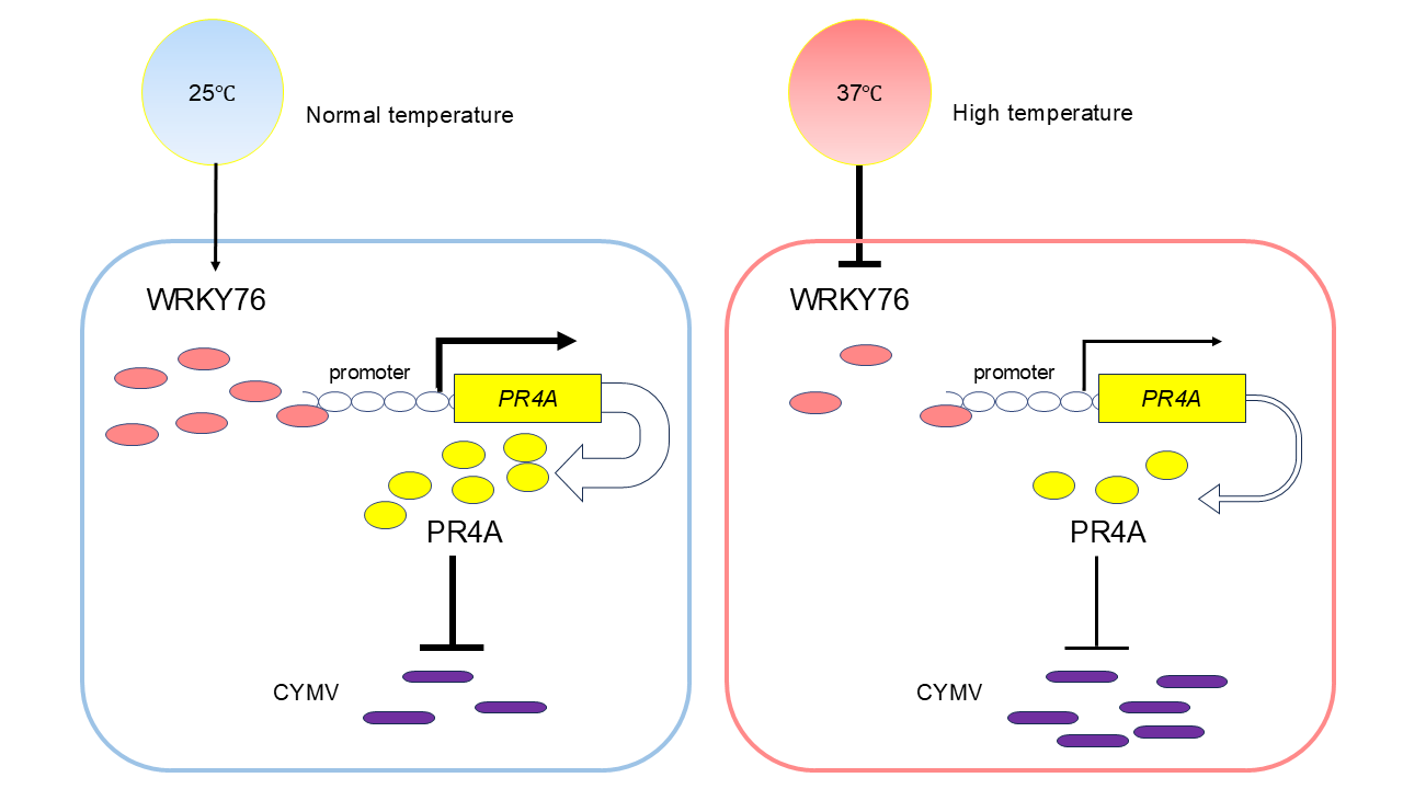 图3. 高温抑制CsWRKY76-CsPR4A模块免疫功能促进柑橘黄化花叶病毒累积的分子机制